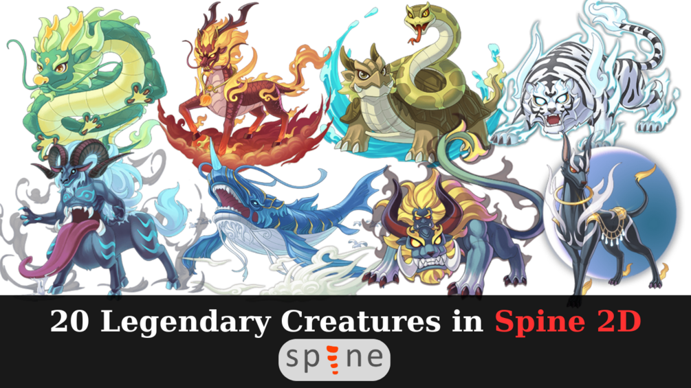 The collection includes 20 legendary creatures animated in Spine 2D, featuring dragons, phoenixes, and fantasy monsters. Each creature has smooth animations, making them ideal for RPGs, fantasy adventures, and strategy games.