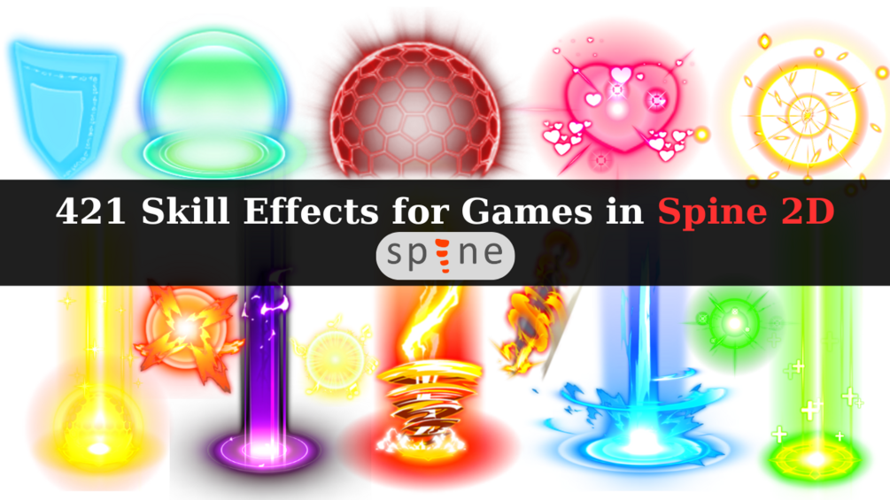 This collection includes 421 high-quality skill effects animated in Spine 2D, designed for various game genres. It features magic spells, melee slashes, projectiles, explosions, buffs, debuffs, and elemental abilities like fire, ice, and lightning.